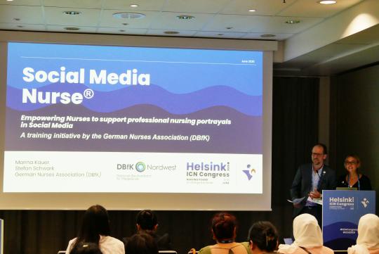 „Social Media Nurse – Empowering nurses for ethically reflective and nurse-led portrayals in Social Media: the development and implementation of a targeted education program by the German Nurses Association“ (Social Media Nurse – Stärkung von Pflegefachpersonen für ethisch reflektierte Darstellung professioneller Pflege in sozialen Medien: Entwicklung und Umsetzung eines gezielten Bildungsprogramms des Deutschen Berufsverbands für Pflegeberufe) lautete der Titel des Vortrags von Marina Kauer, stellvertretende Geschäftsführerin des DBfK Nordwest, und Stefan Schwark, Referent für Öffentliche Kommunikation. Damit ist auch schon das Programm dieses einzigartigen Lehrgangs beschrieben, das in verschiedenen Modulen Kompetenzen vermittelt wie