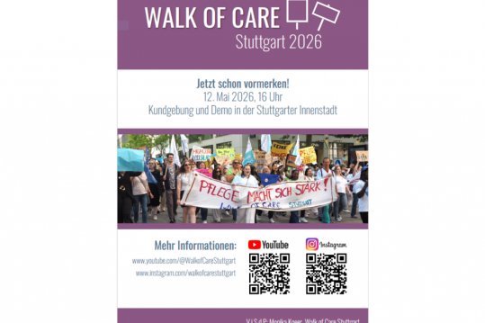 Dennoch, oder gerade deswegen, möchten wir dafür sorgen, dass die Anliegen und Forderungen der Pflegenden nicht mehr von den Tagesordnungen verschwinden. Wir wollen Präsenz zeigen und jede:r kann mitmachen. Merkt euch den Termin jetzt schon vor: am 12. Mai 2026, dem Internationalen Tag der Pflegenden, startet der nächste Walk of Care um 16 Uhr in Stuttgart. Wir freuen uns, wenn ihr und eure Kolleg:innen mit dabei seid.